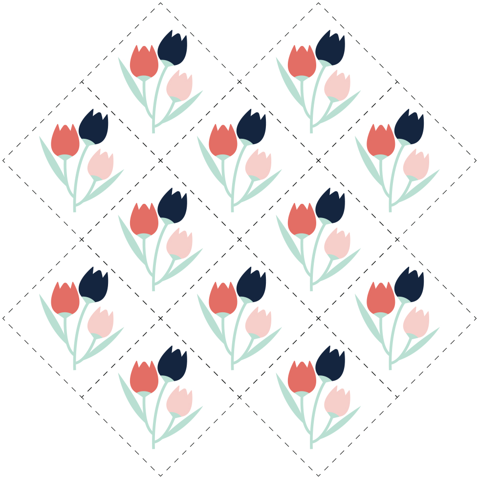 This standard repeat system is prevalent for floral repeating patterns. Imagine tossing a handful of flowers up into the air. When they fall back to the ground, they become scattered. The flowers face in all directions, creating an organic and non-linear arrangement. Placing the design motifs randomly within the tile will form this type of repeat.